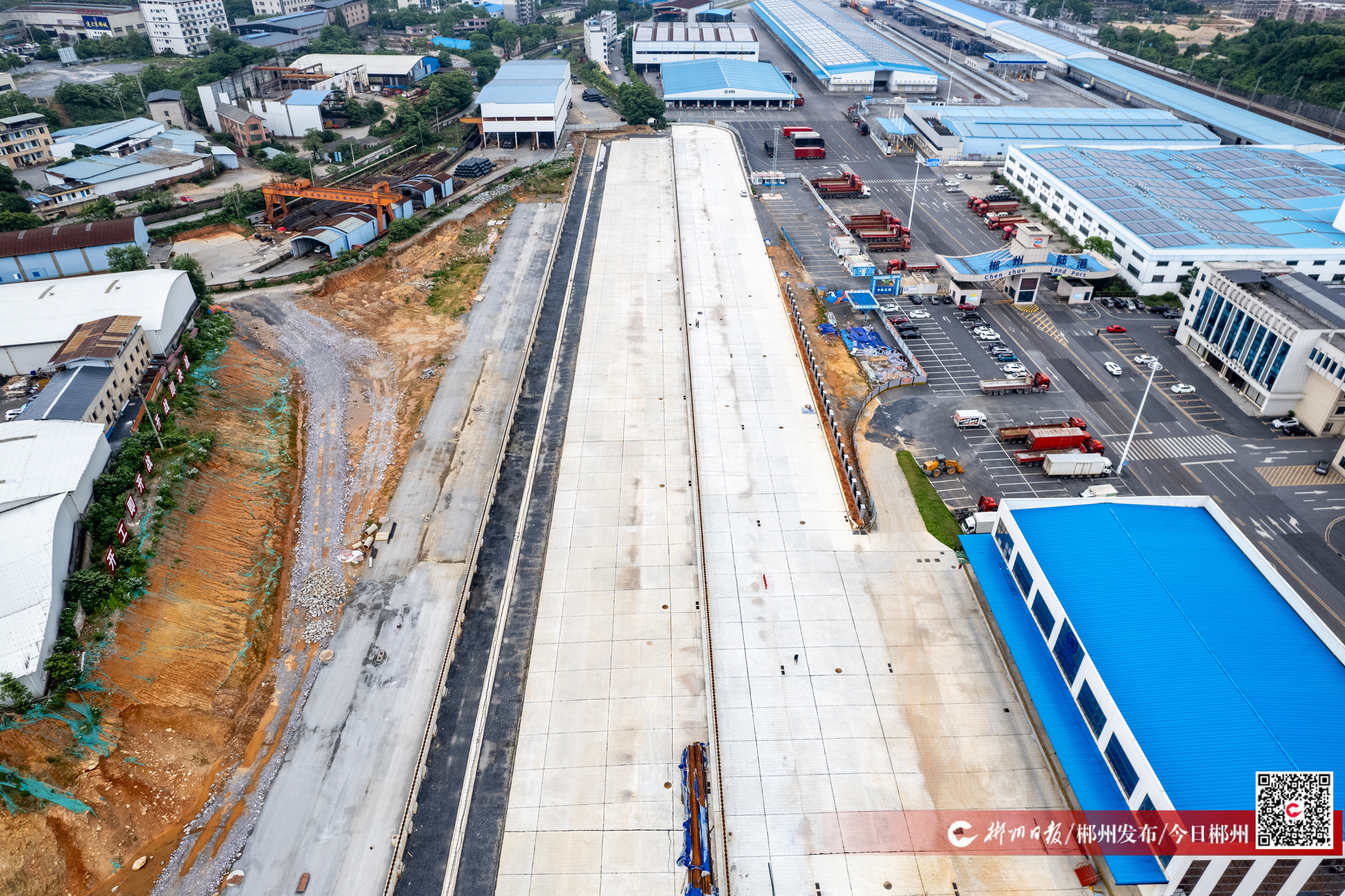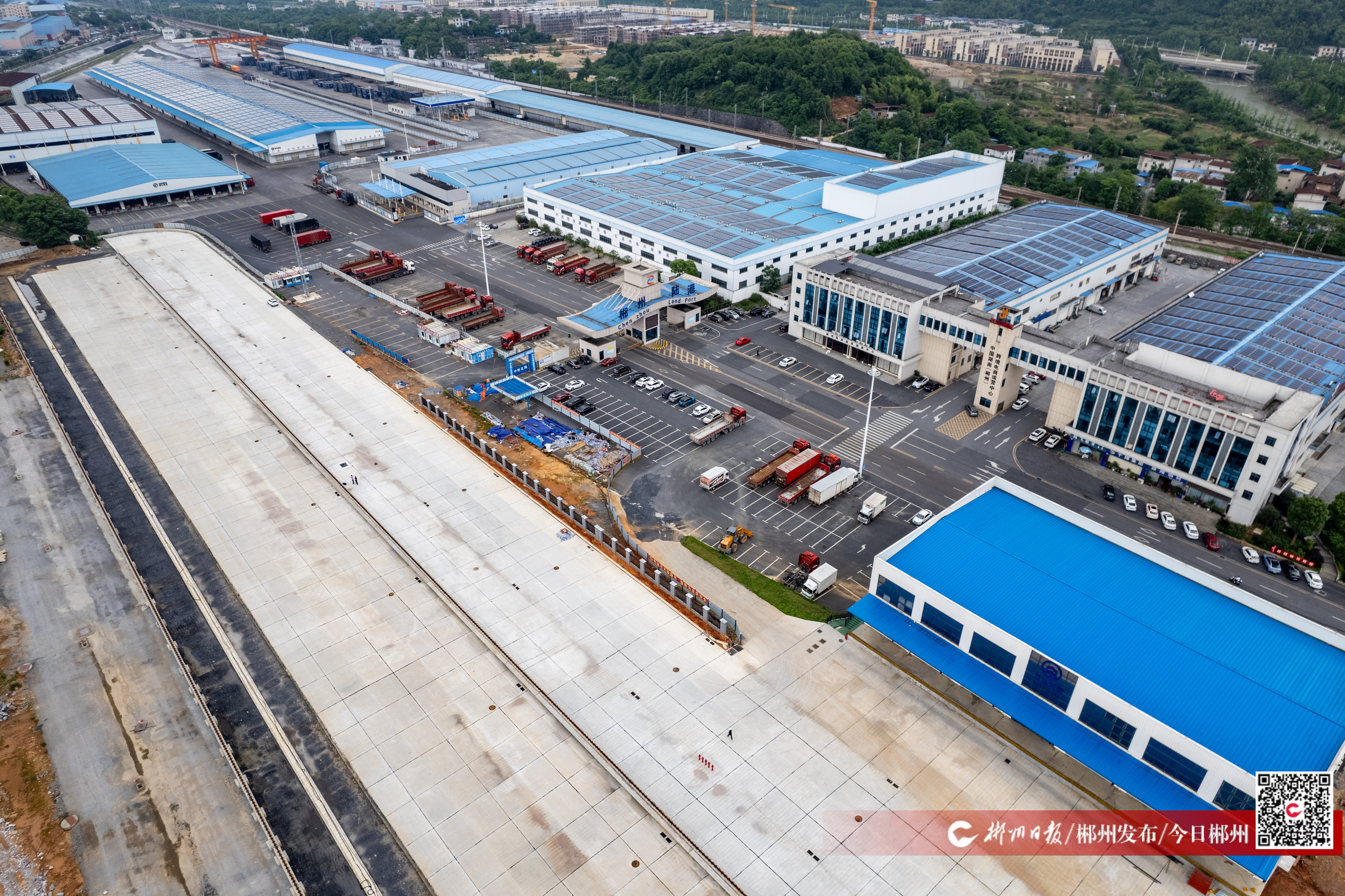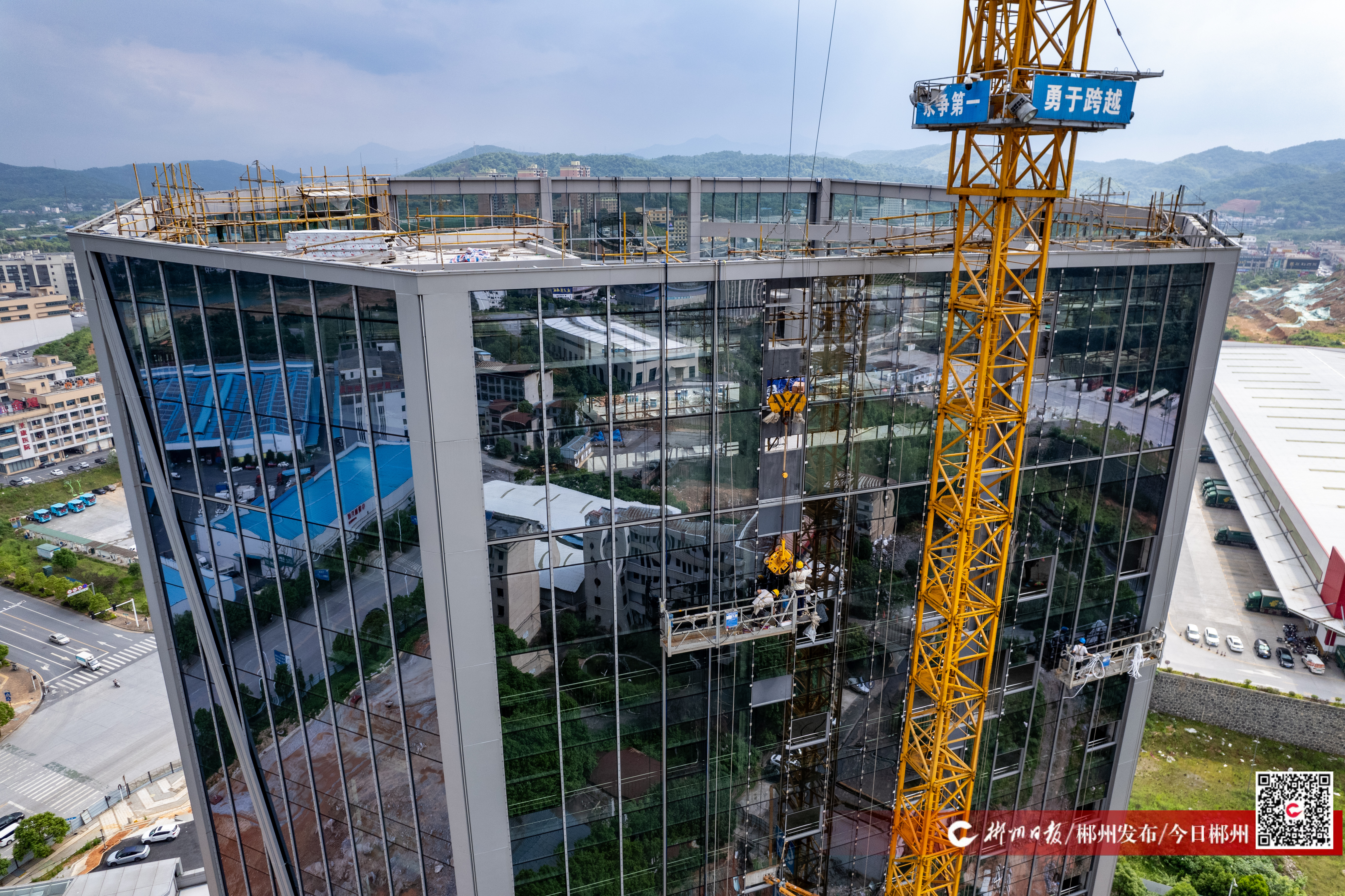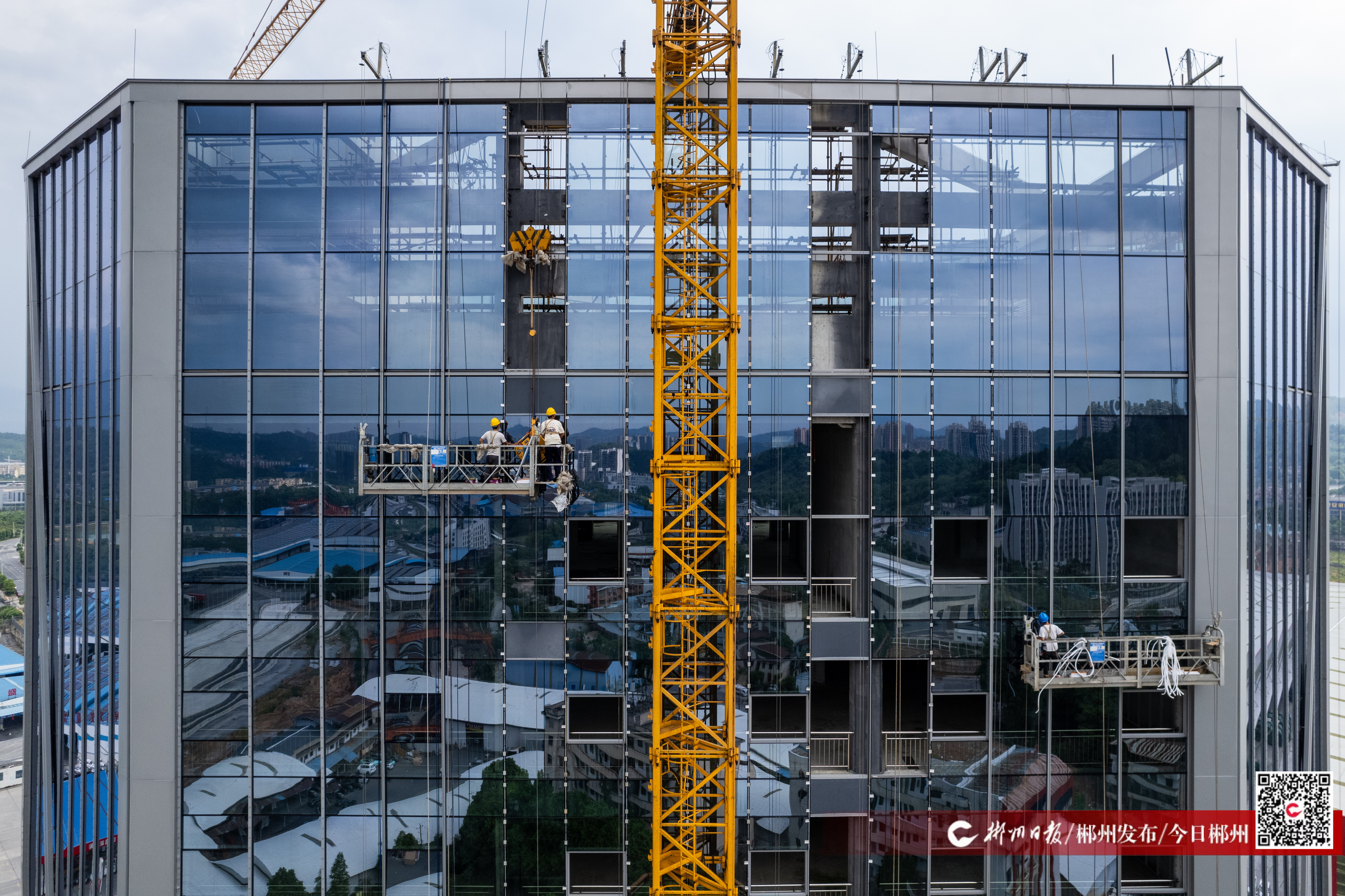 5月7日,郴州陆港物流基地建设项目施工现场,工人正在总部经济大楼外开展高空作业,安装玻璃幕墙。郴州陆港物流基地建设项目为2024年省重点建设项目,项目工程内容涵盖房建、市政、铁路三大专业,分总部经济大楼和铁路1号线、铁路2号线三大区域施工。项目建成后,将降低企业物流成本,带动湘品、郴品快速融入中非、中欧、东盟新通道“经济圈”,成为湖南省对外开放的“桥头堡”。目前,铁路1号线货物堆场已经完工,总部经济大楼预计今年6月份正式投入使用。